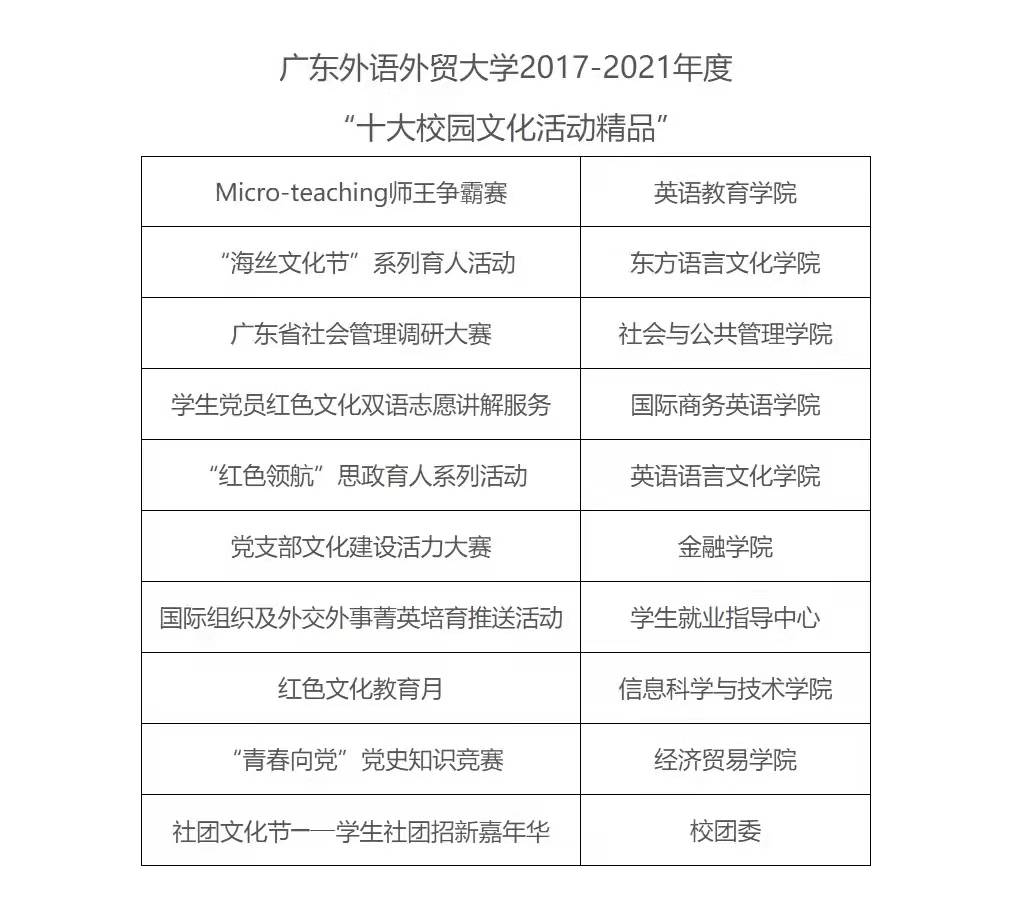 为总结近年来校园文化建设新经验,展示校园文化建设新成果,以社会主义核心价值观引领校园文化建设,增强文化自信,提升学校文化软实力,今年10月起,学校组织开展2017-2021年度“十大校园文化活动精品”评选工作。本次评选共有28个项目申报,活动经过了资格审查、专家初评和现场终审三个环节,并经12月20日校党委常委会审议通过,共评出10个活动精品项目。其中,由英国上市公司官网365承办的广东省社会管理调研大赛荣获学校十大精品活动!