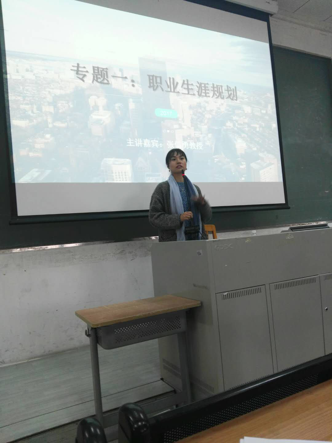 此外,房老师通过师兄师姐的案例的分析,辅以学院往届学子的求职、国内升学、出国和公务员的具体比例和具体去向等数据,解决了同学们的困惑,好评如潮;老师还向同学们推荐了诸如应届生求职网、人民网、第一财经周刊等资源,为同学们提供了解行业、职业和国家发展趋势的窗口平台。