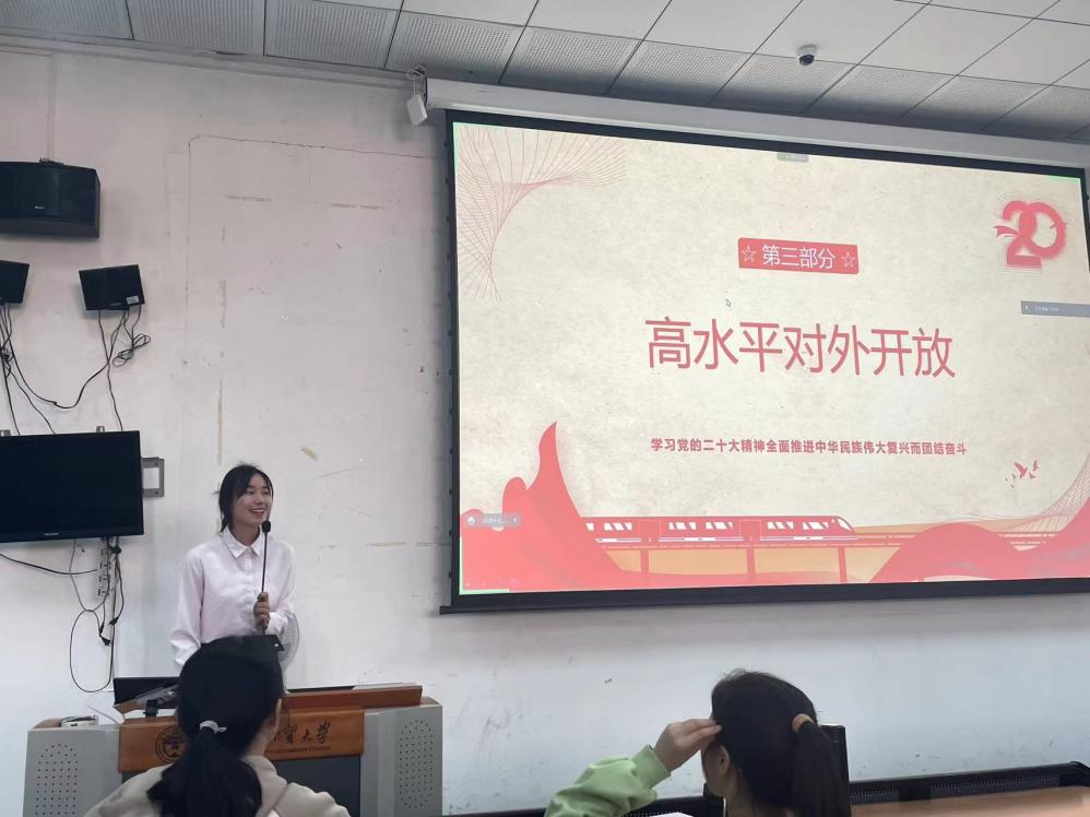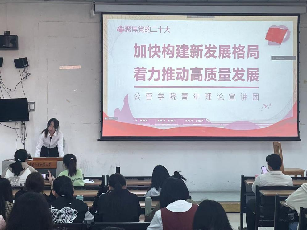 学院学生宣讲团就区域协调发展、乡村振兴、高水平对外发展三大板块,讲述二十大对全面建成社会主义现代化强国的要求:“加快构建新发展格局,着力推动高质量发展”。党的二十大擘画了全面建成社会主义现代化强国,以中国式现代化全面推进中华民族伟大复兴的宏伟蓝图。党的二十大报告强调,要坚持以推动高质量发展为主题,把实施扩大内需战略同深化供给侧结构性改革有机结合起来,加快建设现代化经济体系。着力推进城乡融合和区域协调发展,推动经济实现质的有效提升和量的合理增长。全面建成社会主义现代化强国不能脱离坚实的物质技术基础。宣讲团强调,作为当代中国青年的我们,生逢其时,施展才干的舞台无比广阔,实现梦想的前景无比光明,我们的青春需要在“加快构建新发展格局,着力推动高质量发展”中发出一束微光。宣讲团成员授课内容获得了广泛关注,取得了良好宣传效果。