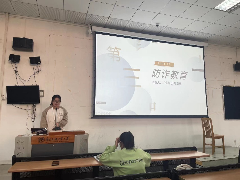 开学第一课中,莫杰老师提醒同学们,应关注在校园内和校园外的道路行走、乘坐交通工具时的人身安全,密切关注和提高安全意识。他强调,为确保学生在校安全,学院将严格遵循学生请假流程,紧抓晚归情况管理。陈思恩老师对实习就业中存在的陷阱及如何维护自身权益展开分享,强调为学生实习就业信息收集和三方协议签订中的问题。随后,就大学生被诈骗问题,叶清清级长总结大学生受骗六大类型,并提出针对性预防措施,强调“不轻信,不转账”。