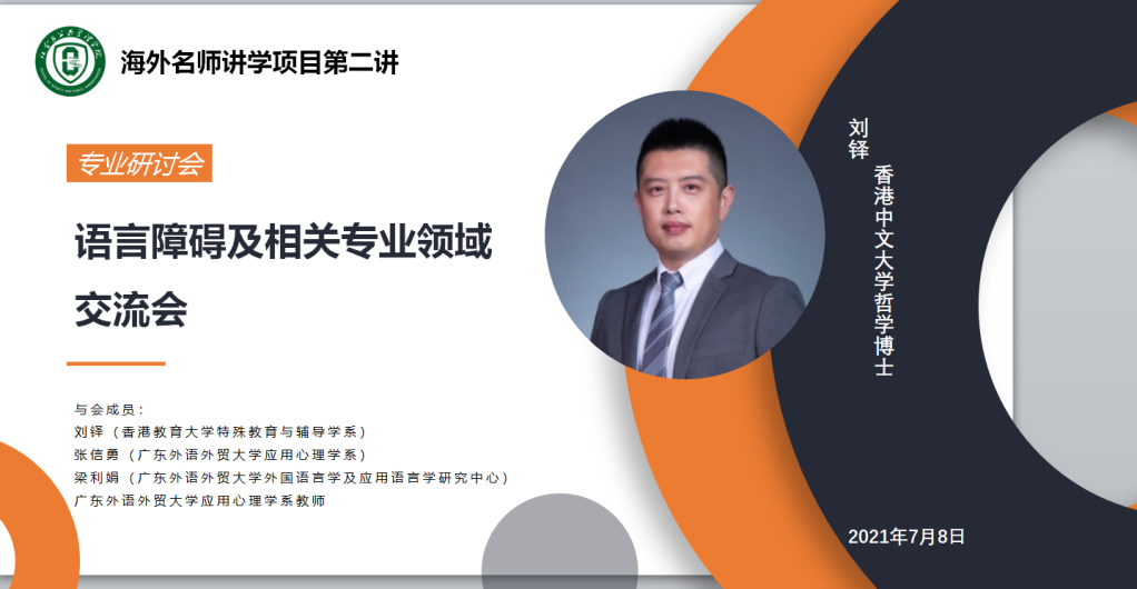 2021年7月6日上午,英国上市公司官网365举办了关于语言障碍及相关专业领域交流会。该交流会为海外名师讲学项目第二讲,香港教育大学特殊教育与辅导学系系主任刘铎博士为主讲嘉宾,应用心理学系全体教师参与,会议由张信勇副院长主持。