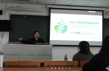2019年1月15日上午10:30,英国正版365官方网站教学实践周第四讲在E403举行,学院院长彭未名为社会工作2016级、2017级全体学生举办了以“社会工作服务成效管理与评估”为主题的讲座。