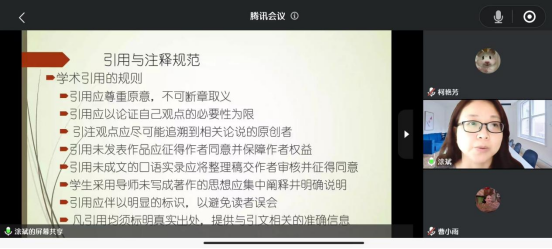 涂斌明确介绍了那些行为属于学术不端行为,并提出当学生有学术不端行为时,根据学生管理的相关规定,会受到相应的学籍处分和针对学位的相应处理,并且通过七个案例具体地陈述了这类行为产生的不良后果。随后,她提出有效实现学术规范的四个关键点,向同学们介绍了在选题与资料、引用与注释方面需要注意的要求、规则以及内容格式。