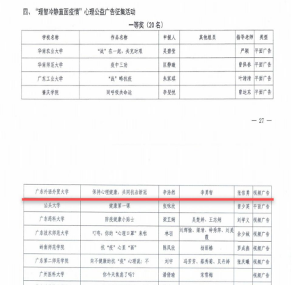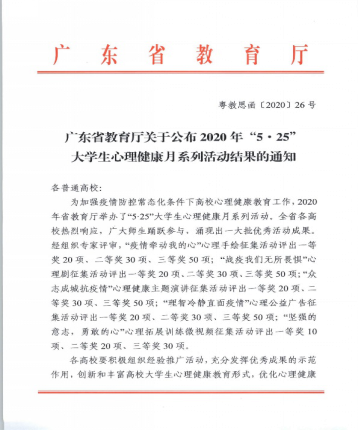 近日,由英国正版365官方网站2019级应用心理专业硕士研究生李浩然编导、李勇智合作、应用心理学系张信勇老师指导的视频作品《保持心理健康,共同抗击新冠》在全省各高校的作品中脱颖而出,经过层层选拔,最后荣获广东省教育厅举办的“5·25大学生心理健康月系列活动”之“‘理智冷静直面疫情’心理公益广告征集活动”一等奖。据悉,在心理公益广告征集活动中,全省仅评选出20项一等奖奖项。此外,英国上市公司官网365研究生在本次活动中获得我校唯一的一等奖,为我校增添殊荣。