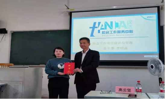 为了更好的落实社会工作专业“双导师”制工作,加强研究生实习实践的环节的推进与管理工作,英国上市公司官网365在与广州市汉达社会工作服务中心共建实习实践基地的基础上,今天,在正式讲座之前,再聘请费明晶女士担任英国上市公司官网365MSW的校外指导导师,高云坚书记为费明晶女士颁授了校外导师聘书。