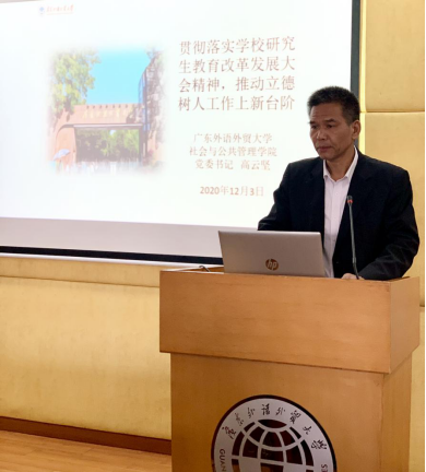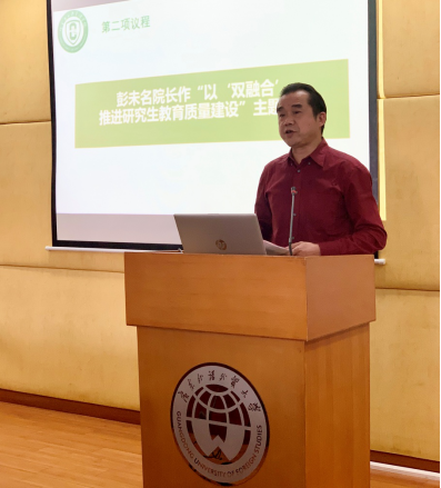 会上,高云坚作“贯彻落实学校研究生教育改革发展大会精神 推动立德树人工作上新台阶”主题报告,他传达了11月26日学校研究生教育改革发展大会精神,并就师德师风文件进行了深入解读。他表示,导师们应始终不忘立德树人之初心,牢记为党育人、为国育才之使命;以高尚的灵魂感染和塑造高尚的灵魂;以优秀的自己塑造更优秀的学生。