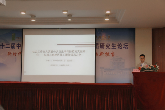 2019级社会工作硕士研究生黄佳豪在大会主论坛进行主题发言