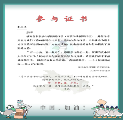 袁志平在得知新冠病毒爆发的新闻后,自1月26日起,便主动参与到“高原鹅行动”(高校学生援鄂行动)中,通过互联网搜寻抗疫所需物资的生产商,共计联系27个厂家,以资源对接的方式为湖北地区的医院筹集到护目镜、口罩、医用酒精等一批又一批的医疗物资。即使由于疫情,不能出门参与到志愿活动中,但是袁志平依然发挥自己社会工作的专业能力,在家中通过网络积极参与到抗击疫情的志愿服务中。
