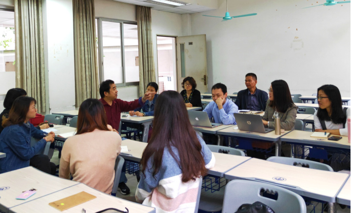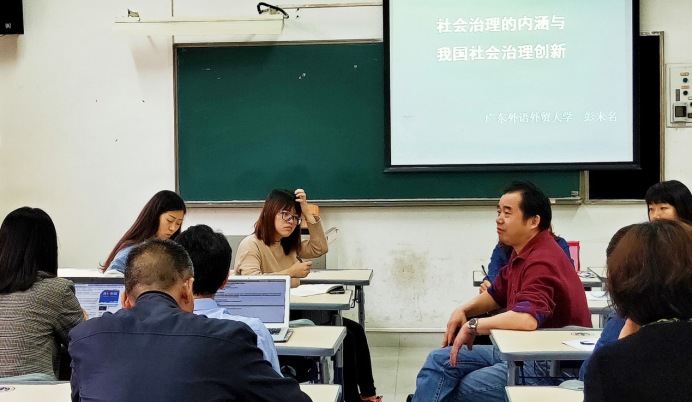 4月16日上午,在高云坚书记的带领下,近10位学院新任年轻硕导和部分党外教师走进南粤优秀教师、广东省高校思政课名师彭未名院长的课堂,彭教授就“社会治理的内涵与我国社会治理创新”的专题,与2018级硕士研究生和新任年轻的硕士生导师进行了充分的交流。彭未名教授授课经验丰富,讲解问题深入浅出,讲课富有激情。参与交流的师生深受启发。