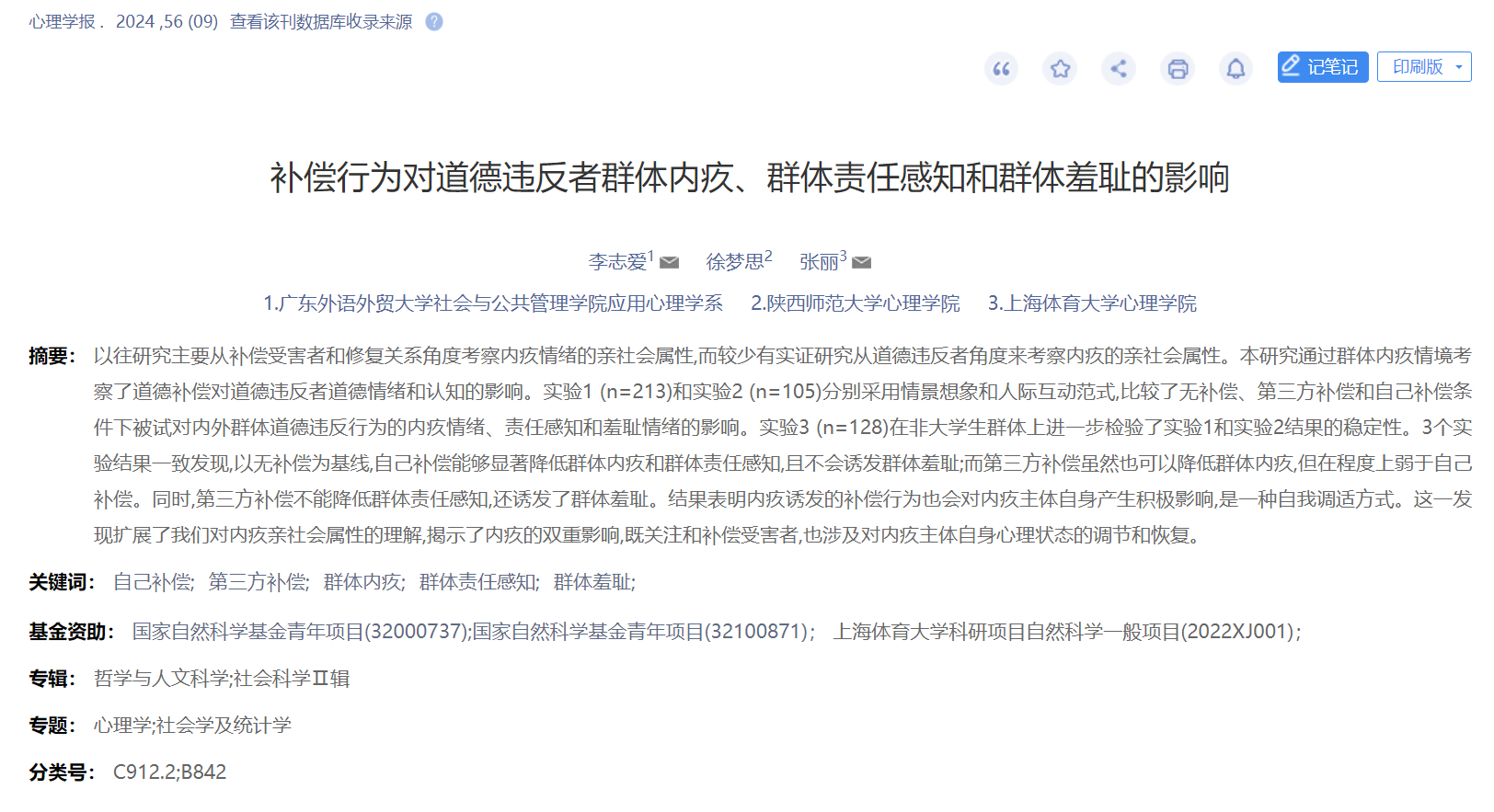 论文题目:补偿行为对道德违反者群体内疚、群体责任感知和群体羞耻的影响