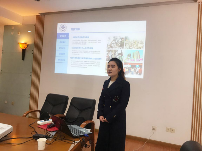 吴蓉博士以“城市社区居民的地方依恋及其对社区参与的影响研究——以广州为例”为题展开话题。为研究广州市居民城市依恋情况,通过大量数据样本的量化分析,研究发现:相同因素对于社区依恋和城市依恋的作用机理不同,不同人群的地方依恋机理亦有不同,针对地方依恋的研究,要针对不同尺度、不同群体人口特征进行分类,尤其是本地居民和外来移民的差异。为研究地方依恋对居民社区参与的影响,研究根据TRA(Theory of Reason Action,理性行动理论)和TPB(Theory of Planned Behavior,计划行为理论),重点考察社区参与行为(频率)和社区参与期望两个维度,探索地方依恋、社区参与行为和社区参与期望三者间的内在逻辑与影响路径,以期突破地方依恋与社区参与的内生性矛盾。同时,根据已有研究,受社会人口特征、社区特征和社区交往等因素的制约,社区参与行为并不能直接反映居民未来的社区参与期望。因此,她认为地方依恋对社区参与的影响机制存在两条路径,一条是直接影响路径,另一条是以社区参与行为为中介变量的间接影响路径。互动环节中,涂斌教授就路径系数与吴蓉博士展开讨论,陈胜副教授充分肯定了其研究的规范性,张信勇副教授则重点对其在学科交叉方面的优势表示认同并对其未来研究方向给出建议。