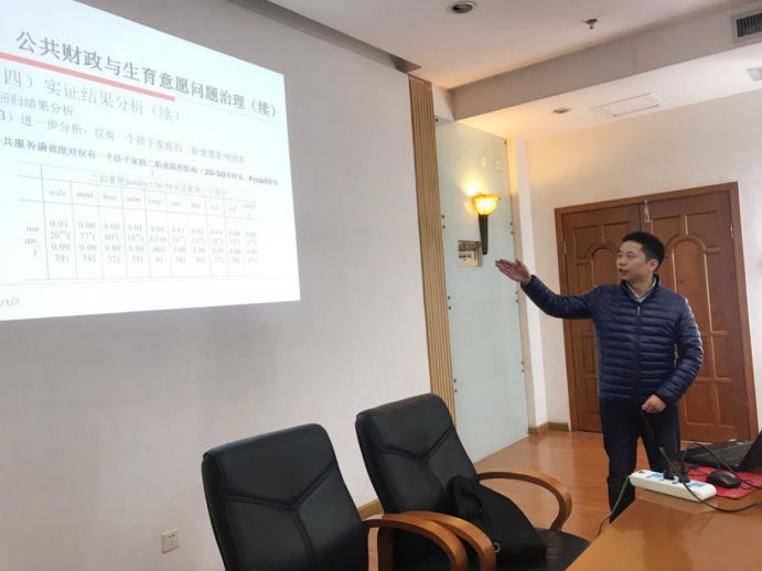 梁城城博士的主题是“社会力量参与社会治理的路径和机制——基于公共财政视角的理论和实证分析”。他表示经济社会形势的变化使得我国需要建设“社会治理体系”。关于公共财政与生育意愿问题治理,他利用中国综合社会调查2013年和2015年数据考察了公共服务满意度对居民生育意愿和二胎意愿的影响。通过计量模型构建和回归结果分析发现:无论是不同种类公共服务满意度、还是公共服务满意度因子,以及总体公共服务满意度,均对居民意愿生育数量和二胎意愿有不同程度的促进作用;公共服务满意度存在着影响居民幸福感进而作用于二胎意愿的路径机制;公共服务满意度影响生育意愿存在年龄差异和城乡差异。关于公共财政与居民幸福感,研究基于中国综合社会调查(CGSS)数据和省级宏观数据,在使用Ordered Probit等计量模型分析后发现,地方政府财政行为对居民幸福感影响显著。关于基层财务治理与居民获得感,他通过运用Probit和OLS等计量模型发现:村级信息公开的三个指标对农村四类公共产品有着不同程度的影响。针对上述三个问题的研究结果他分别给出了相应的对策建议。互动环节中,陈胜副教授就公共财政的宏观性与研究数据的微观性之间的不对性与梁城城博士展开深入讨论,并建议其引入多层次分析。