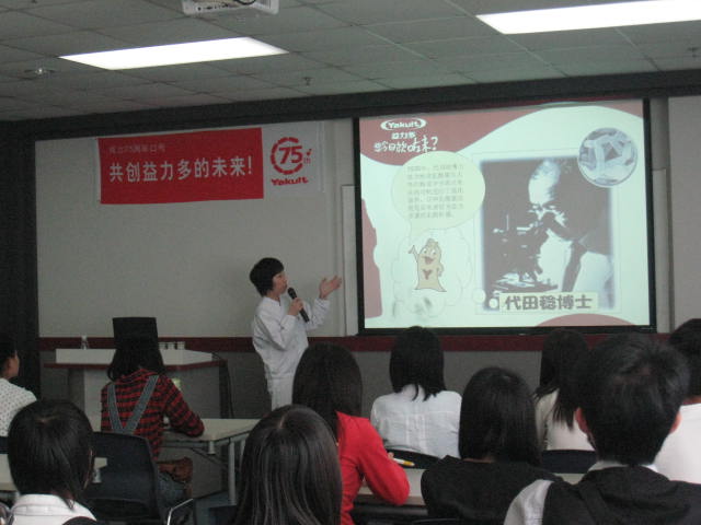 简要参观完公司的外部环境之后,我们随即进入展览厅,工作人员开始为我们热情介绍益力多公司的相关情况。其中包括,益力多公司七十五周年的历史、广州益力多公司成立的历史、益力多菌的研发与作用、益力多品牌的各项产品,以及益力多饮品的生产过程。工作人员不仅借助ppt作了一个详细的讲解,还通过为我们播放益力多生产过程的视频给予我们初步印象。在观看视频期间,工作人员给每位参观者发放一瓶新鲜的益力多供大家品尝,以及一支笔作为参观留念。