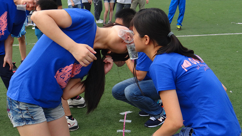 结束了开幕式,就是本次趣味运动会的重头戏了。本次趣味运动会有四个比赛项目,分别是:十人十一足、水杯“接吻”、集体跳绳、兵乓球接力。每个项目都是考验班级运动员的团结协作能力,十人十一足要求大家步调要一致,水杯“接吻”和兵乓球接力都要两两的配合,集体跳绳更是考验所有人是否反应一致。比赛开始前,每个班级都认真做赛前准备,抓紧最后的时间练习,不一会儿所有运动员都满脸通红、汗流浃背,为了班级荣誉大家都拼了。经过了一番激烈的争夺,最后,获得一等奖的是12心理班,二等奖的是12行二和12公管班,三等奖的是12社工 、13行二、13社工班。