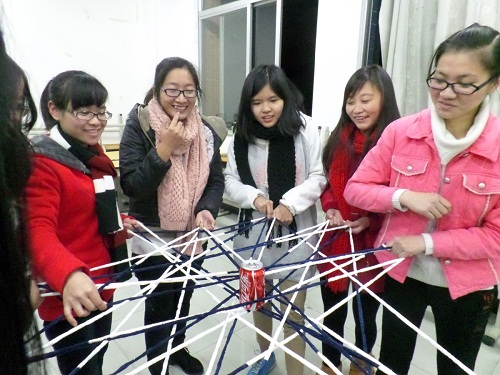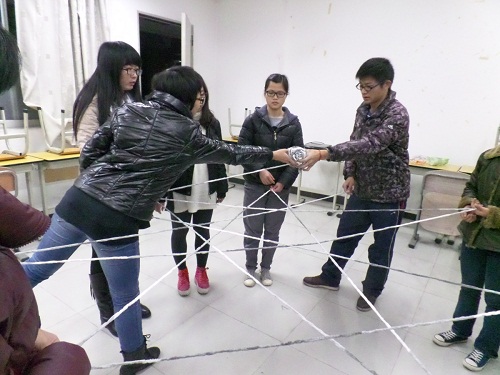 如果说颇具神秘感的寻宝大行动让到场的社员们满载而归,那么接下来的心理游戏“温暖同心网”则更让大家受益匪浅。游戏规则社员们分成两组,各围成一个圈,通过把毛线圈扔到对面小伙伴的手中来编成一个网,直至网的中心密集到可以支撑起一罐汽水任务才算完成。在第一轮,两组成员配合默契,迅速掌握要领,完成的时间都非常短。第二轮限时三分钟,两组交换一半成员后进行,一组的进度稍显落后,先完成的一组过来给予一些建议,协助他们完成,例如指导他们把线拉紧,帮他们固定汽水罐后跟他们一起倒数15秒,并在他们成功后送上鼓励的掌声,体现出政管自强人的互助互爱。
