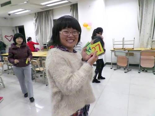 紧接着主持人以神秘的口吻介绍活动第一个游戏环节——“寻宝大行动”。活动教室内藏有40张标明数字的彩色卡片,每一张卡片都对应一个宝箱,寻宝时间为15分钟,结束后宝箱将依次开启。随着顽皮的寻宝音乐响起,社员们疾速离开座位,踏上寻宝的征途。寻宝路上大家可谓各出奇招:有人侧着身子,伸长脖子在逐张桌子底下探索;有人小心翼翼地挪动桌脚,挪完一张又一张;门缝、窗台、黑板架等小地方也无一幸免,甚至连主持人的帽子和口袋也难逃一劫。每个找到宝藏的人都难以抑制内心的兴奋,不禁哈哈大笑,眼眯成线。