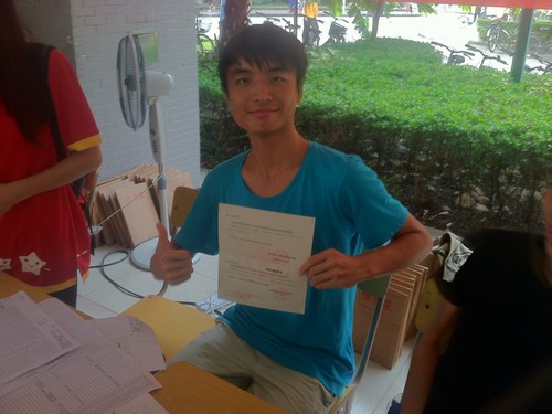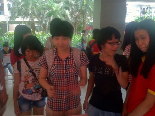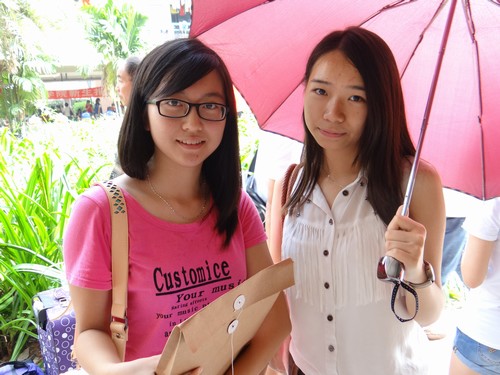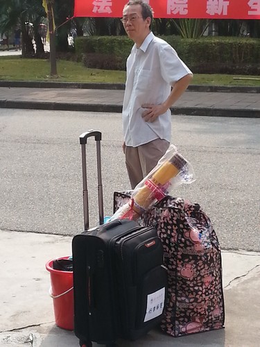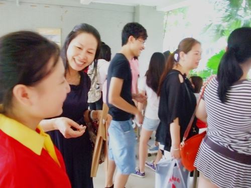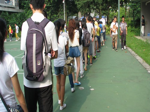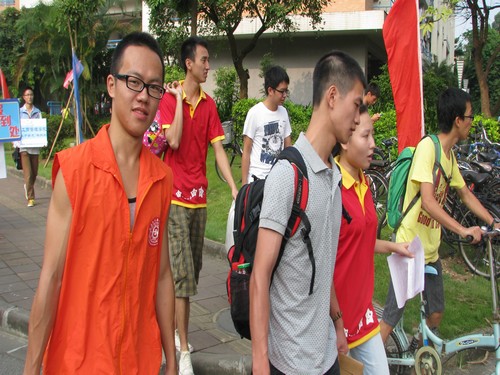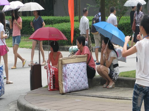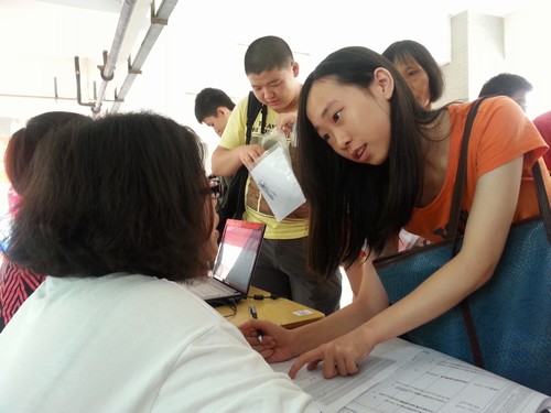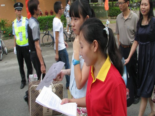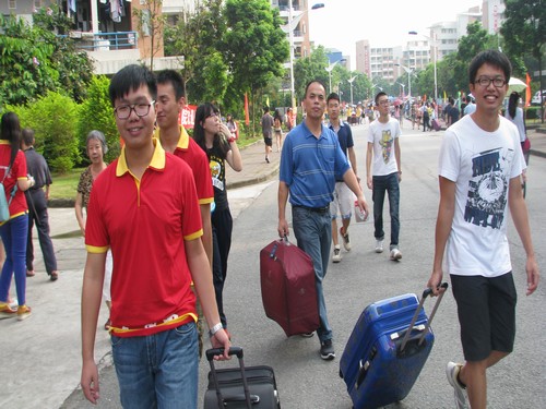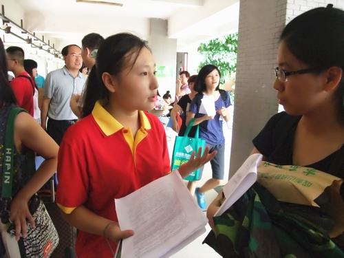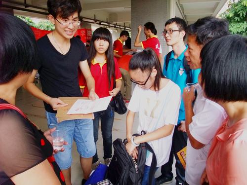 炎炎烈日,学生家长们却仍很耐心地等待自己的子女办完报到手续。