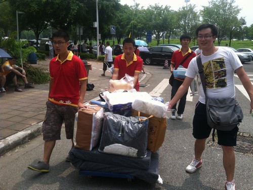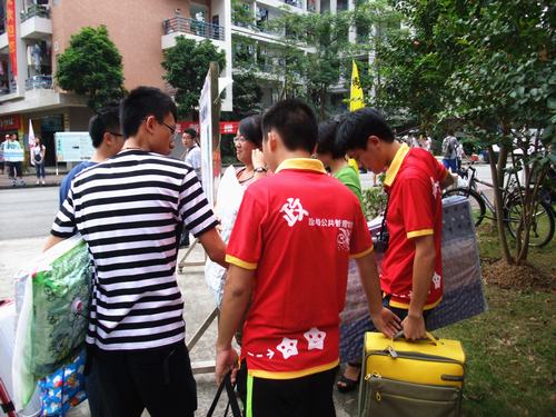 两位志愿者在当“苦力”帮新生带行李上去宿舍,辛苦啦~