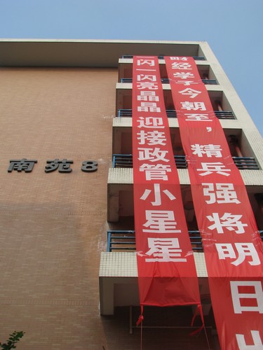迎新活动还未开始,宿舍楼就悬挂了充分体现学院大小星星特色制度的迎新标语
