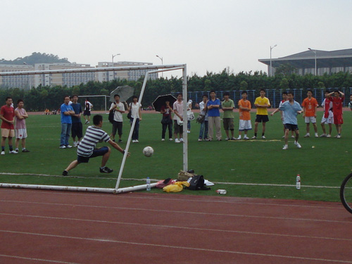4月11日下午4点,在南校区的足球场上,政管学院05行1和06行2进行了一场“政管杯”男子足球比赛。最后以点球的方式决出胜负。06行2以5:4险胜05行1。