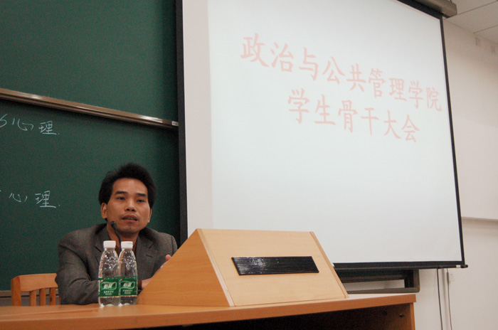 11月28日晚,学院党总支副书记麦培年召开了政管学院学生骨干大会,大会出席人员包括党员、预备党员、团学干部、干事、各班班委、各宿舍舍长。本次会议麦书记就本学期开学以来遇到的种种关系到学生学习,生活和未来发展的重大问题进行了具体而明确的阐述,并重点提到作为学生骨干应履行的责任和义务。