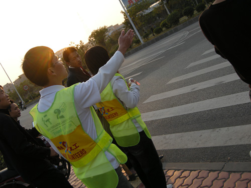 此外,交通指挥组的成员身穿交警的荧光套装衣服,站立在番禺区市桥镇西环路的十字路口指挥交通。这个十字路口人流和车流非常多,几乎每时每刻都有人和车要经过,所以交通灯差不多十多秒就闪一次。他们站在路口旁,吹着哨子,挥着双手,在络绎不绝的车流中指挥着。大部分的市民都有较强烈的安全意识,能够遵守交通规则,按照交通灯的指示和组员的指挥穿过马路。但是,组员们也遇到头痛的事情,一部分人的交通安全意识淡薄,即使车辆已快靠到身边,他们依然冲出马路。等到组员吹哨子和上前去阻止他们时,他们却已跑到了马路对面。该组成员对记者说,落实科学发展观需从人们的观念意识上加强。