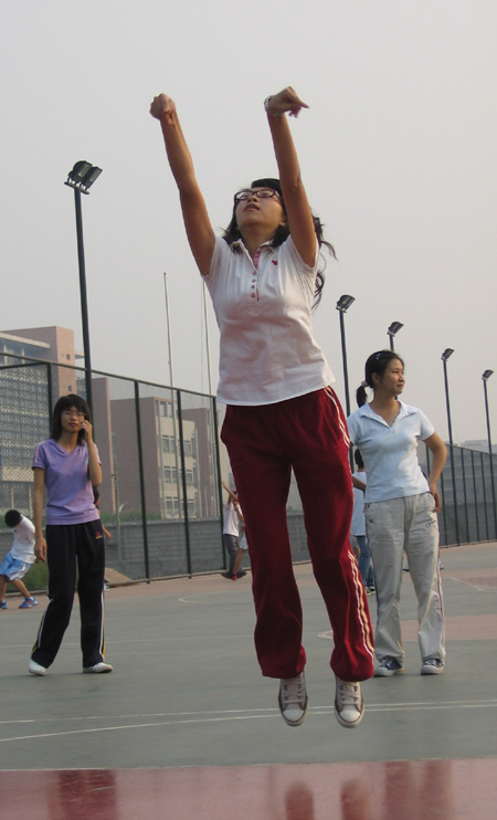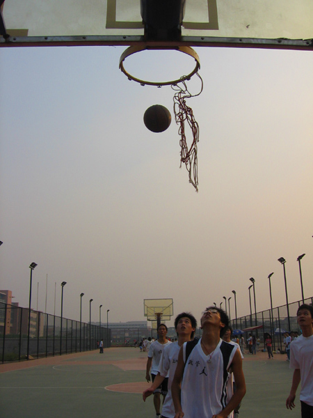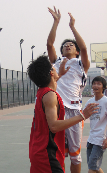上半场,男生的球赛活跃激烈,中场休息的时候,巾帼不让须眉,女生也纷纷加入投篮行列,篮板再高也丝毫不减热情。