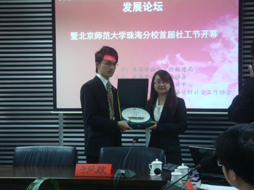 下午两点许,北师大珠海分校党委副书记于风政教授宣布社工节开幕,并发表讲话。于风政教授谈及社会工作应运而生的必然性,社会工作的变迁和未来发展趋势。于教授表示虽然社会工作历经劳苦,在各种纷争中逐渐褪去,但纵观社会,如今因受经济市场的扩大、分配制度等等因素影响,社会出现分化,部分群体得不到保障,从而使社会对志愿工作关注度越来越高,政府更注重专业人才的培养,推动着社会工作的发展。社会工作的发展过程,必然困难重重,不过在港澳台发展程度的推动下,珠三角社会工作将有一番新天地。