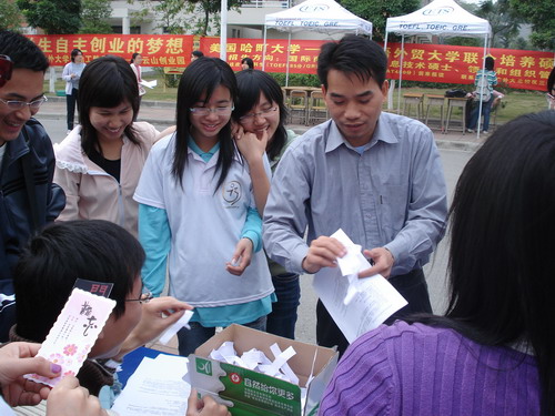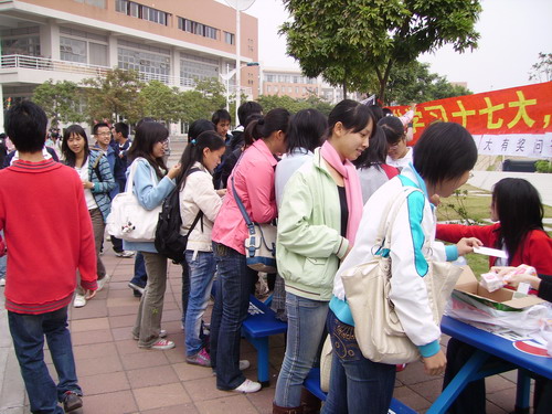 为了响应学院和学校关于“全面深入学习和领悟十七大精神”的号召,06级行政管理2班团支部开展了“学习十七大,青春凝聚党旗下”主题团日活动。认真学习了“十七大报告”内容,全面深入理解了“十七大精神”后的同学们决定来到校道开展寓教于乐形式的有奖问答和签名活动,借此宣传“十七大精神”,号召更多同学关心党和国家建设。