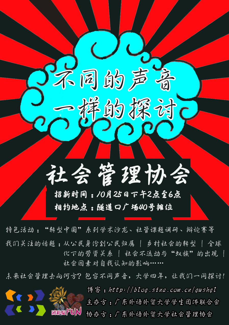 广东外语外贸大学社会管理协会会员招新正式开锣啦!“不同的声音,一样的探讨”是我们的口号,共同
