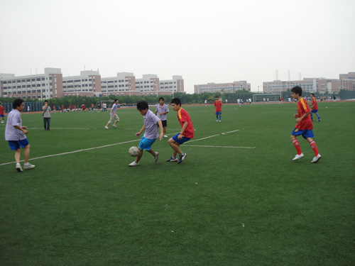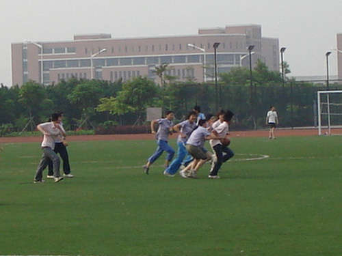 4月16日下午4点05分在南校区的足球场,举行了“政管杯”英美混合足球赛的小组赛,参赛双方是06应用心理班和07应用心理班。双方各有得失,男子足球方面,06心理班以4:0的大比分赢过07心理;但女子橄榄球方面,07心理以8:3同样大比分获胜。