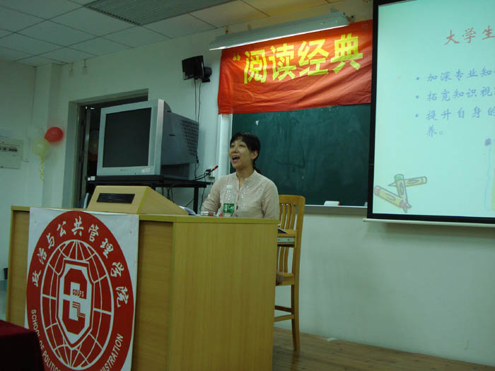 开幕式最后一项中,余芳老师为同学们作了题为”读书与读书报告”的讲座。在余老师诙谐幽默的语言中,同学们不仅学习了怎样写读书报告,也学到了几种怎样选书和怎样读书的方法,可谓收获颇多。 在院领导的大力支持下,在老师的热心指导下,在同学们的积极参与下,相信”阅读经典,走近大师”政管学院第一届学术月活动一定会圆满成功!
