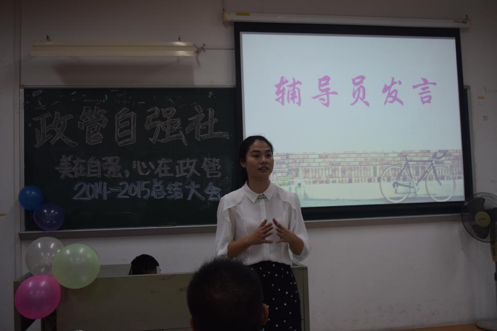 首先,政管自强社的指导老师房老师发表讲话,表示支持政管自强社的活动,同时给出对发展政管自强社的建议,期待政管自强社在新任干部的带领下越办越好。接着,刘舒婷社长总结这一学年社团的工作,表示对指导老师、社长团、社员等的衷心感谢,其中,社长提及的对社团工作开展的反省与期待,让新干部有所思考。