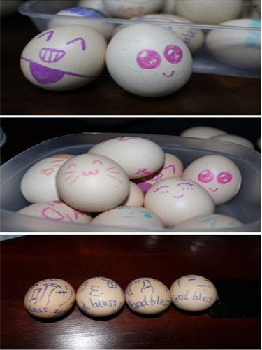 由于在宿舍不能使用大功率电器,同时也怕鸡蛋的壳会煮破使祝福和温暖无法传达,所以我们希望能让饭堂在空闲时间帮我们把鸡蛋煮熟,我们再在上面画图案和写字。于是,在中午午饭过后,生活委员和文娱委员便找到二饭二楼的负责人,希望能得到饭堂的鼎力支持。