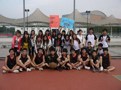 上半场,行二大家庭中便开始了你追我赶,师兄师弟不分上下的局面。双方队员都尽自己的最大努力,认真发挥自己的水平。拉拉队在旁呼声不断。11行二﹕“11行二,加油!11行二,我们挺你!”而09级的师兄师姐也不甘示弱,句句亲切的英文版口号不断。