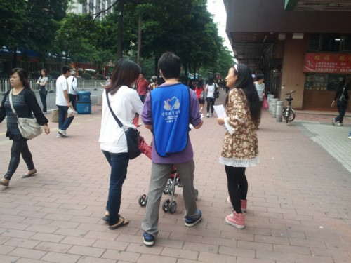 紧接着,在人员安排、任务分配以及行动动员等一切都准备妥当后,劝募工作就热火朝天地开展起来了。队员们两两一组,以大本营——摊位为核心,呈现放射性分布,人人都卯足了干劲,带着满腔的热情,不停地向着过往的路人播撒爱心,介绍爱心包裹活动。但是,事实印证了老祖宗的一句话“万事开头难”,尽管队员们很是尽心尽力的宣传,可惜的是响应寥寥。