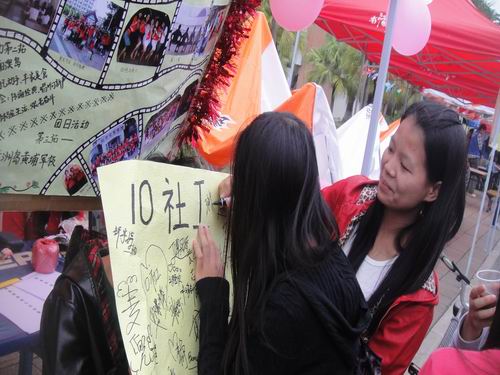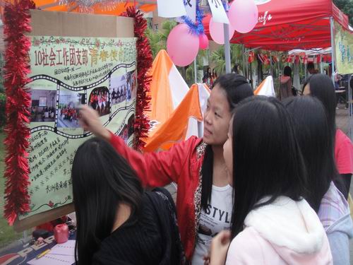 2011年11月10日下午2点到5点半,学校在三饭附近的校道开展了以“青春使命”为主题的团日展示摆摊活动。我们政管学院10社工班的同学积极参与了本次活动。