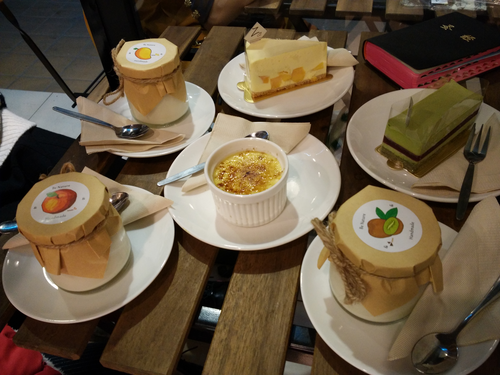 作为一个吃货,怎么能放过舍友倾力推荐的甜品店! 吃过晚饭,慢悠悠地晃到目的地。店面不大。但是放慢书籍和炼奶的书架、木质的桌椅以及昏黄的灯光让小店显得暖暖的,很温馨。我们到店的时候才傍晚六点多,甜品柜上就只剩下几款甜点了。吃货在美食面前都是任性的,所以我们把想吃的都点了。