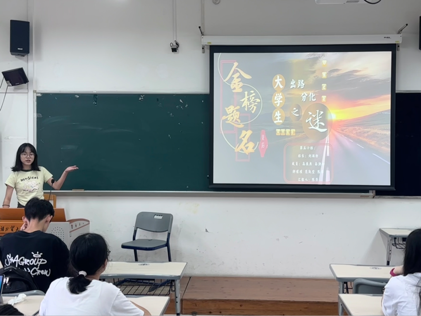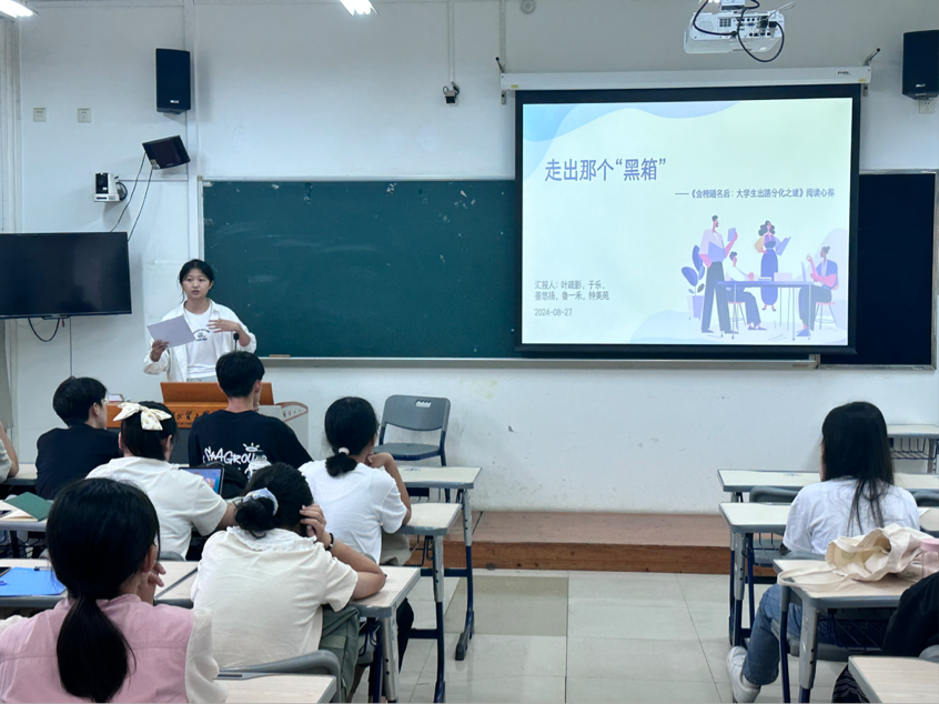 2024级新生于乐作为小组代表汇报发言,本组从该书所处的社会背景出发,通过介绍国内的形势环境详细地阐述了现如今职业发展中会遇到的瓶颈与困惑,并提出了相应的对策。