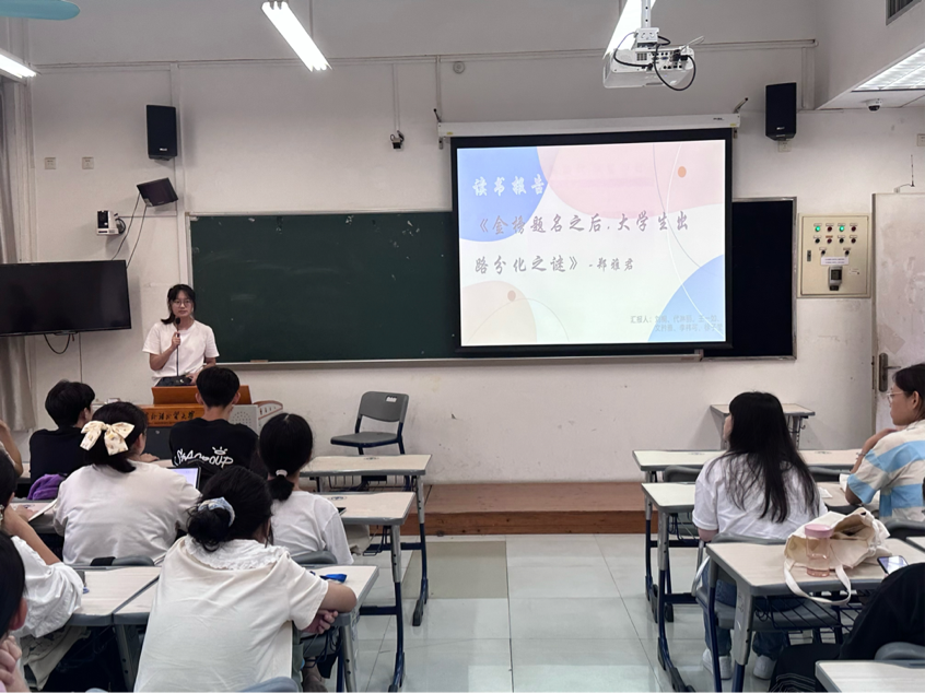 2024级新生陈萍作为小组代表汇报发言,该组聚焦于本书的内容逐章分析,为我们详细地介绍了书籍的基本架构。最后通过分析例句提出本组的见解即在探索大学生活的同时也应该思考自己的未来。