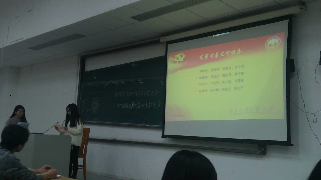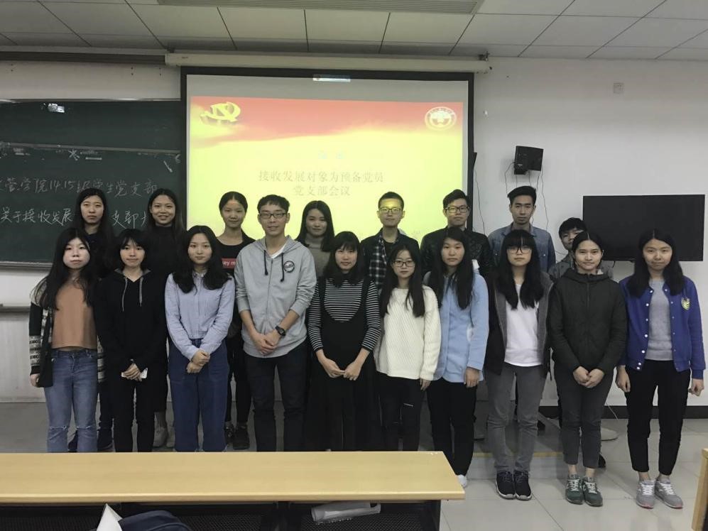 政管学院14、15级学生党支部于2016年11月16日晚上19:30在教学楼C座208室召开关于接收林听听、黄斯韵、袁淑贞、吕小雪、姚晓琳、陈浩权、赖倍恩、黎雪锋、刘彦冲、卢炎贤、周子靖、邓慧敏、孙嘉怿、黄少娴、杨建艺、柯佳平等16名同学转为预备党员党支部大会。参加会议的有支部书记房瑞佳、党务秘书白志华、组织委员陈咏莹、党员付润东同志、发展对象及其入党介绍人。