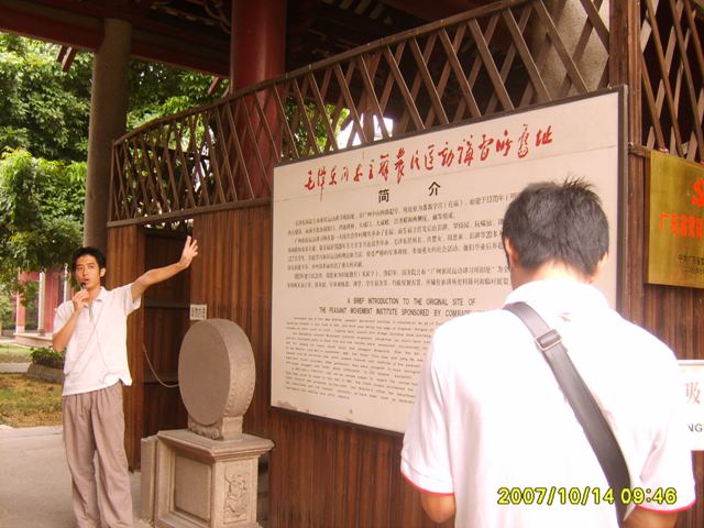 农讲所主办叫毛泽东同志主板农民运动讲习所旧址,由周恩来同志题词,原来是一座番禺学宫(孔庙),现在是爱国主义教育基地,也是一座历史遗产。进入农讲所,给人一种古老的气息。棂星门、大成门、大成殿、崇圣殿、庑、廊等这些名词,勾起了人的想象,眼前似乎晃动着古时学子的身影,在大成殿中口吐“子曰”,飘来一阵古色古香。