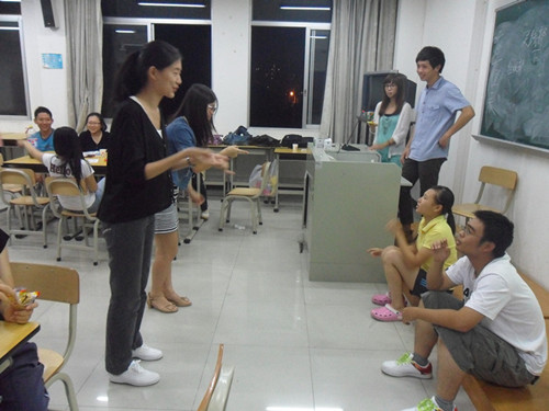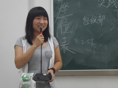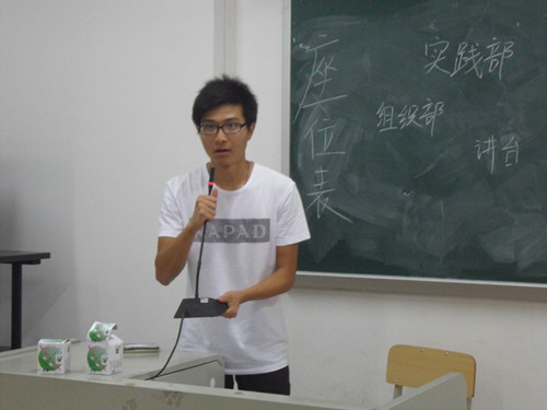 会议开始了,首先由两位主持人实践部副部李剑锋和文宣部副部郑韵诗上台讲述了今天开会的主题和相关内容,此次会议的第一个内容——新干事自我介绍,干事们要在15秒内让会议中的所有人都记住他/她的姓名。于是,新干事们都一一到台上进行了自我介绍,实践部的干事首先上台,然后组织部跟文宣部的干事陆续上台进行了自我介绍。干事们自我介绍完后,便是游戏环节,共有“萝卜蹲”、“蒙娜丽莎芭蕉树”和“你比我猜”三个游戏。欢笑声一直在A303这个教室中回荡,所有的成员都沉浸在这热闹的氛围之中。